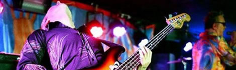Because you see aesthetically, they appear to have dressed for an Ibiza booze cruise, with lead man and Rufus Hound-a-like Carl Puttnam dazzling in his retina-challenging purple trousers and his spectacularly awful pink, turquoise and white shirt. His indoor shades complete his wardrobe malfunction perfectly.