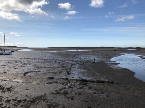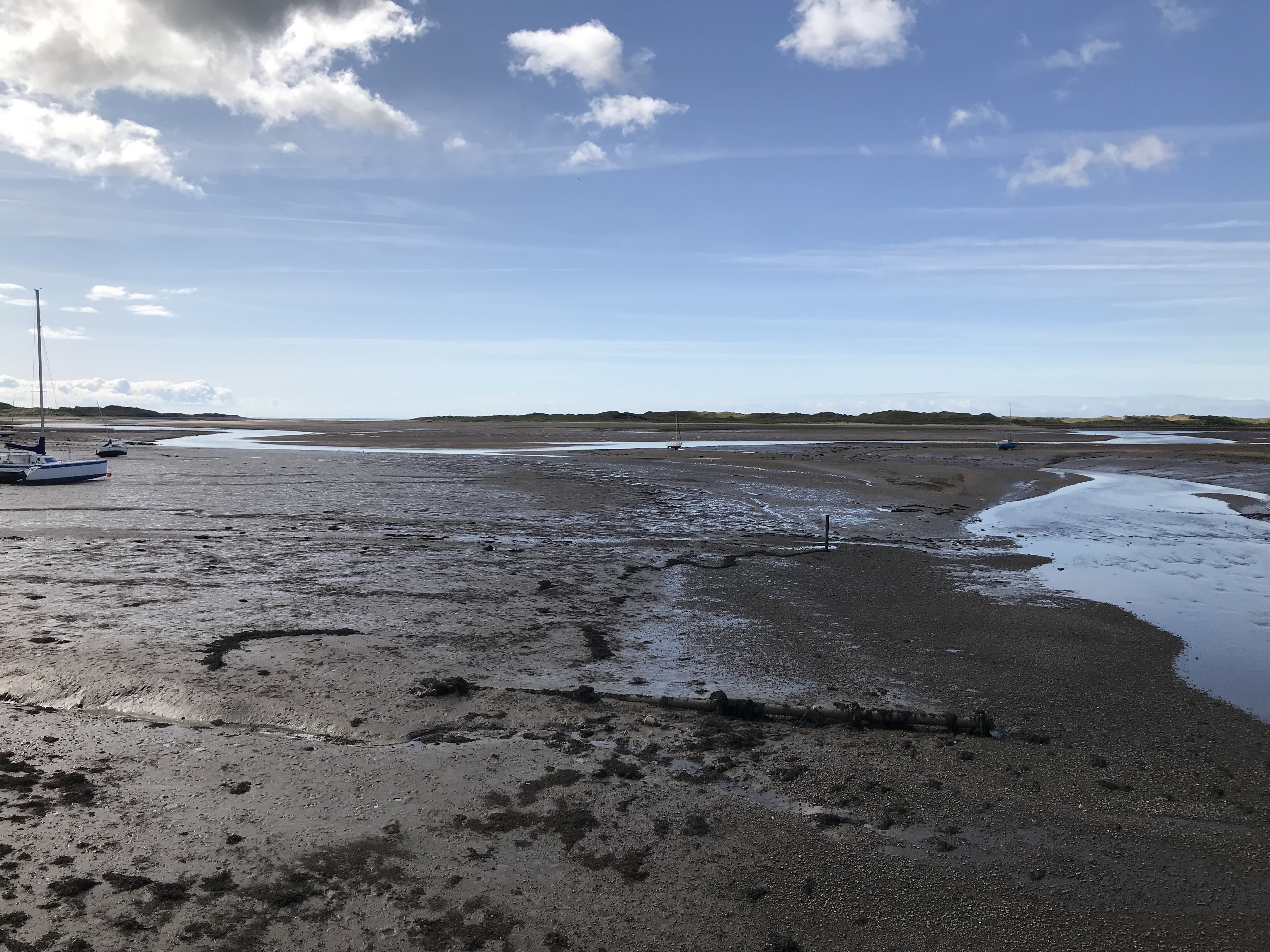 Panoramic view taken from a public footpath on a railway bridge over the River Mite in Ravenglass looking out towards the estuary.